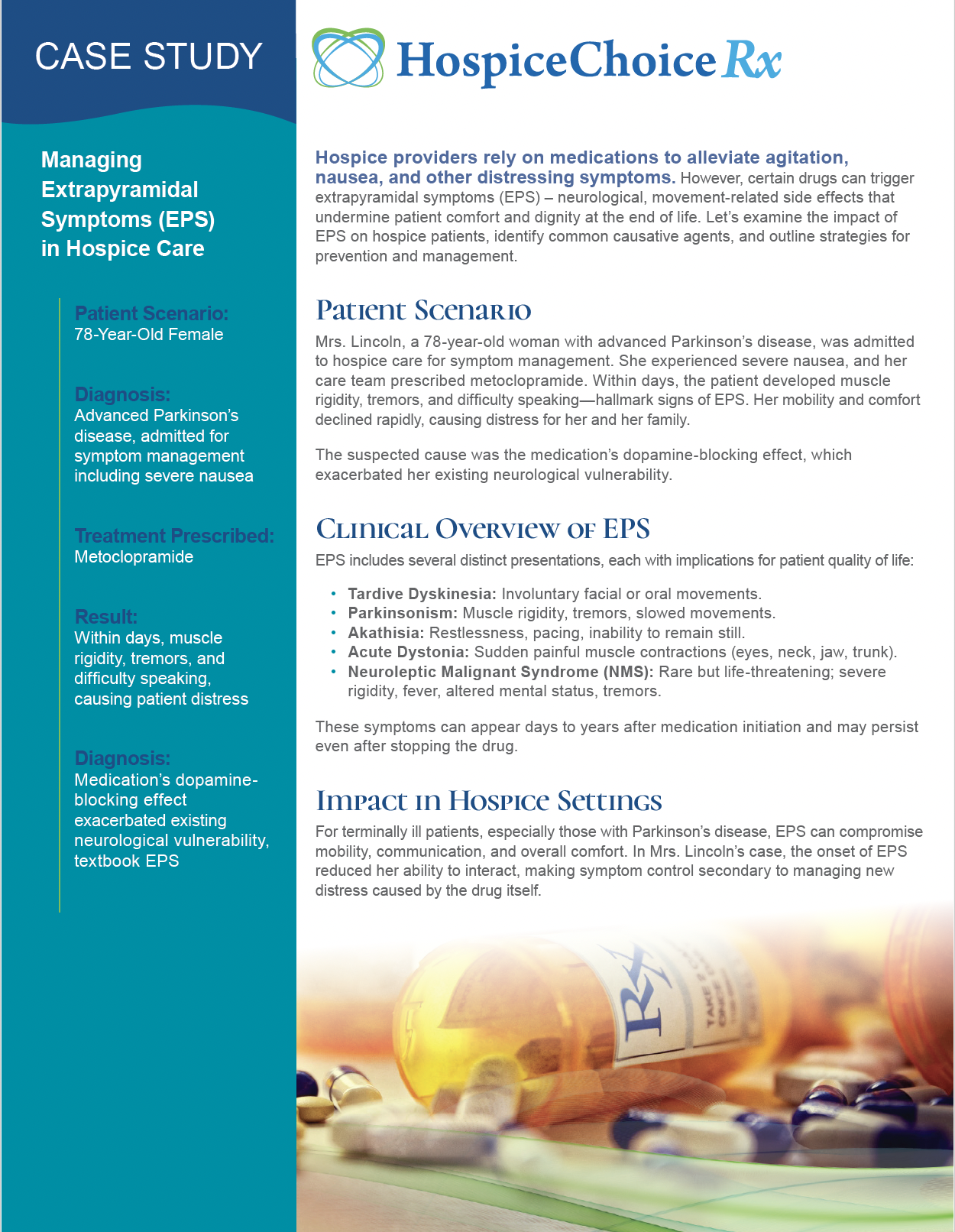 This case study discusses how to manage the symptoms of Extrapyramidal (EPS) in hospice patients. The diagnosis was that the patient's medication's dopamine-blocking effect exacerbated existing neurological vulnerability due to advanced Parkinson's disease.